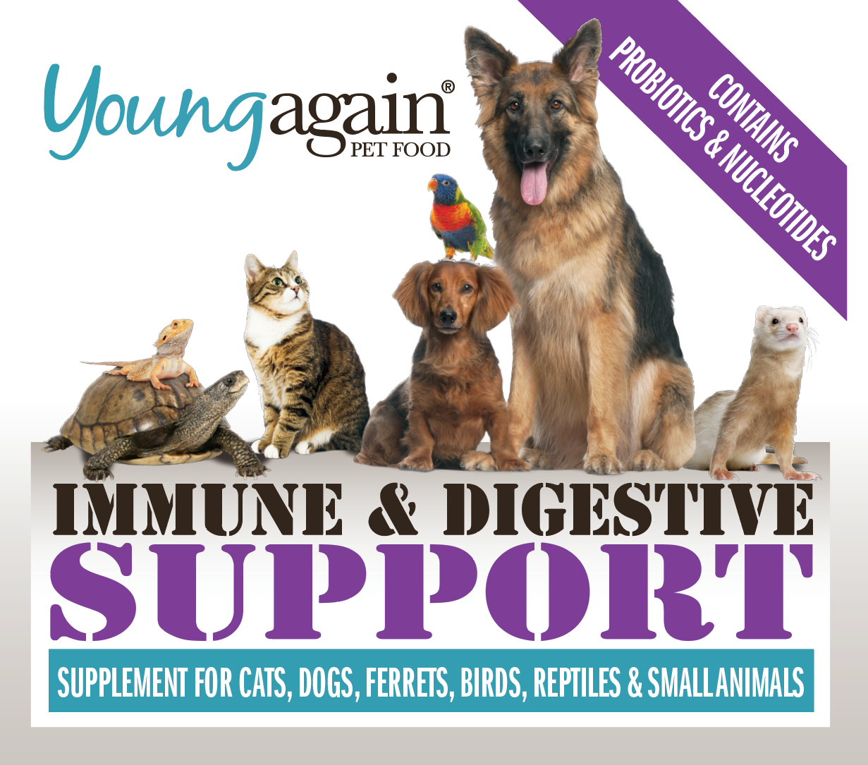 Young Again Immune & Digestive Support contains our proprietary blend of bioceuticals which supply a unique blend of the 5 key nucleotide cell building blocks along with 4 probiotics and 2 enzymes to support your animal's overall health.