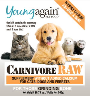 Young Again CarnivoreRAW meat supplements are designed to make a raw meat diet as complete and nutritious as a mouse; one of Nature's most complete foods. We've taken much of the work out of feeding raw and given you a COMPLETE MIX that provides consistent nutrition for your pets. Add salmon oil, water and your choice of meat. FOR THOSE NOT GRINDING BONE Use WITH CALCIUM formula.