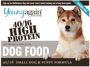 Our 40/16 (protein/fat) formula gives your dog 100% of the balanced nutrition he needs to stay lean, active and healthy. NO grains, glutens, plant proteins, legumes or peas (anti-nutrients) and limited starch/carbs. Young Again 40/16 Dog Food has been developed to support canines with allergy sensitivities, digestive issues or skin and coat issues that may have been caused by an intolerance to these types of ingredients.